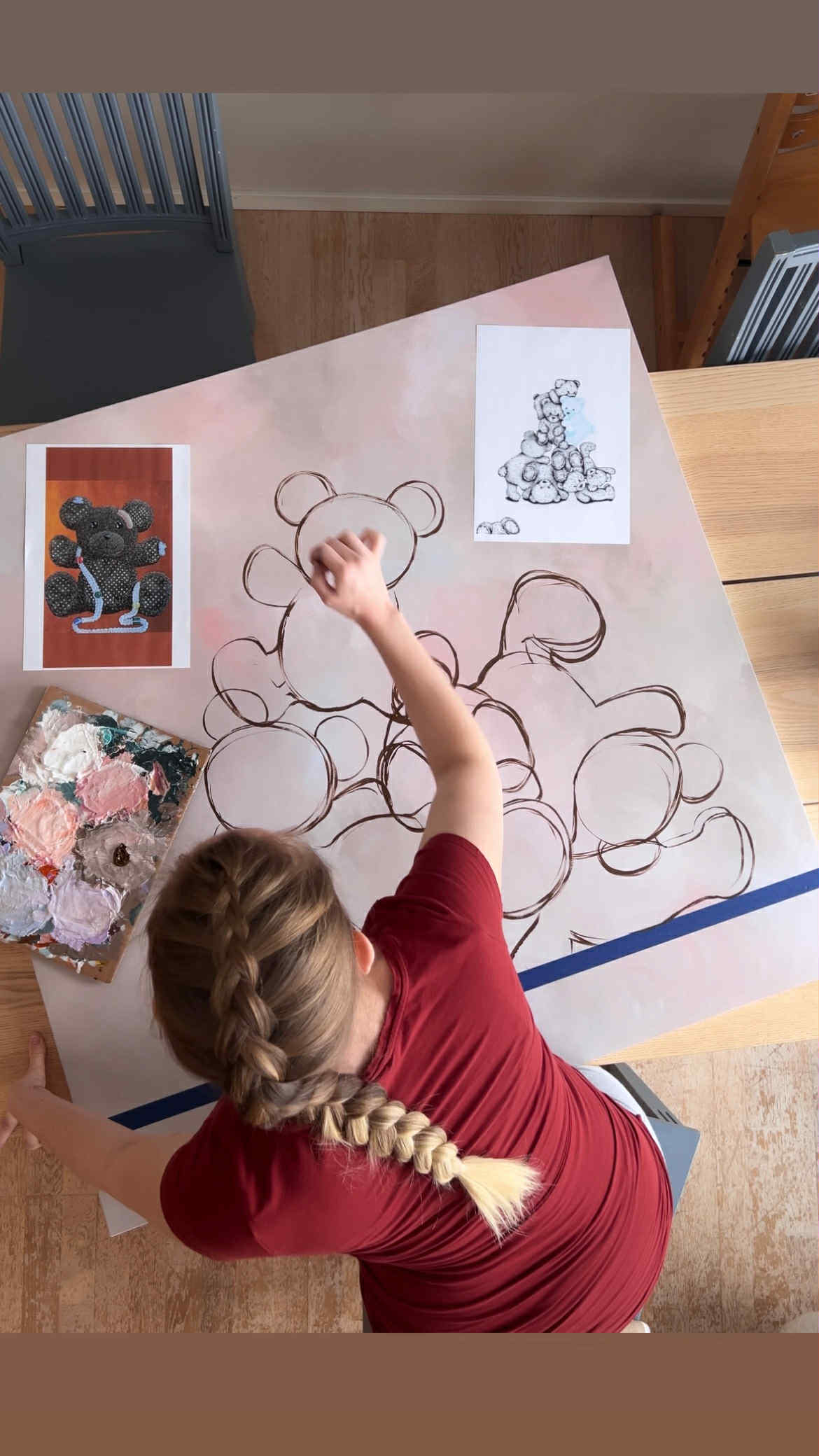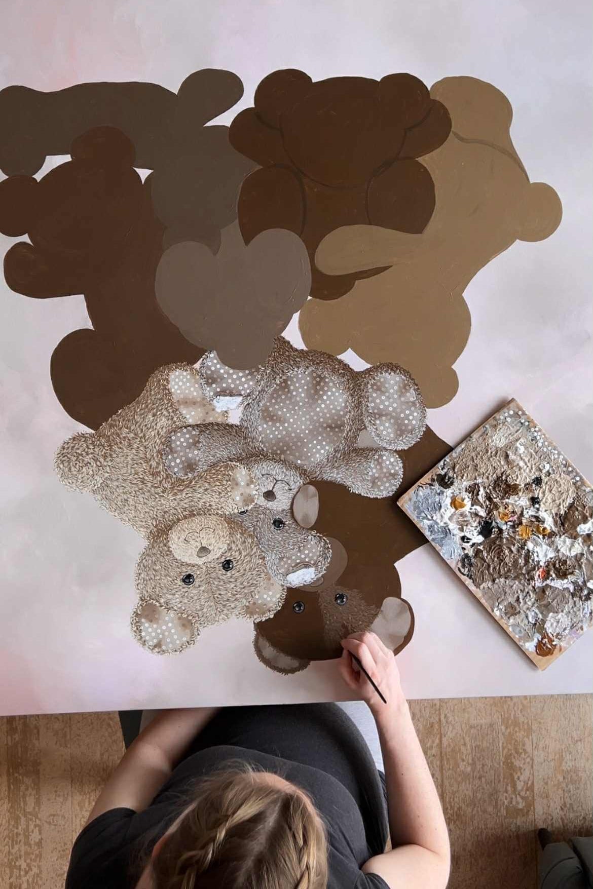 Dette er et maleri jeg har tenkt på å male i flere år.. Det er inspirert av to tidligere malerier, et penn-maleri av bamser som klatrer på hverandre (2017), og et maleri av en bamse som har hull og slitasje slik som disse, fordi den har blitt lekt mye med, fordi den er ELSKET (2021), som var et maleri jeg malte til min søster når hun fikk sitt første barn.